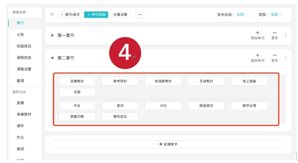 4.可增加“音视频、参考文件、链接、作业、测试”等学习活动内容。