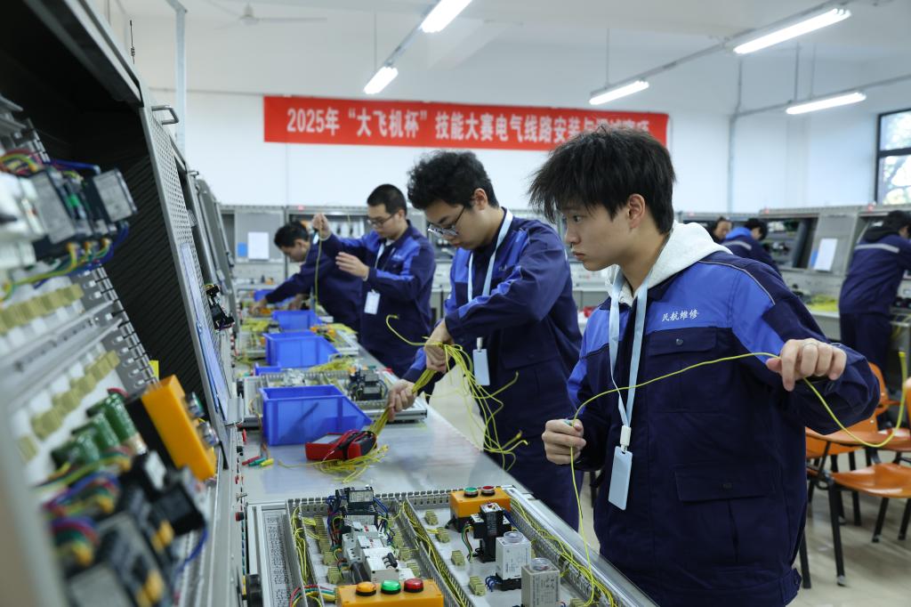 实训室内,飞机制造与维修学院开展“大飞机杯”技能大赛,在航空紧固件保险施工、钳工操作、飞机钣金铆接、机械零件测绘、电气线路安装与调试等多个方面充分展现了学院实践教学的扎实成效。
