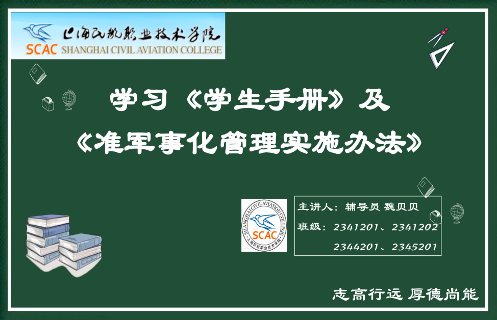 在9月14日晚上,辅导员魏贝贝老师带领民航维修学院2023级中高职贯通班146名新生,认真学习了《学生手册》和《准军事化管理实施办法》中的相关内容,细致入微地讲解了奖励办法、考勤管理办法、作息管理、违纪处分、综测细则、操行评定细则、准军事化管理实施办法等方面内容。通过实例,生动有趣地帮助学生了解学院学生管理规定以及在校行为准则,引导新生建立规章意识,尽快步入健康安全、文明守纪、努力学习的大学生涯。
